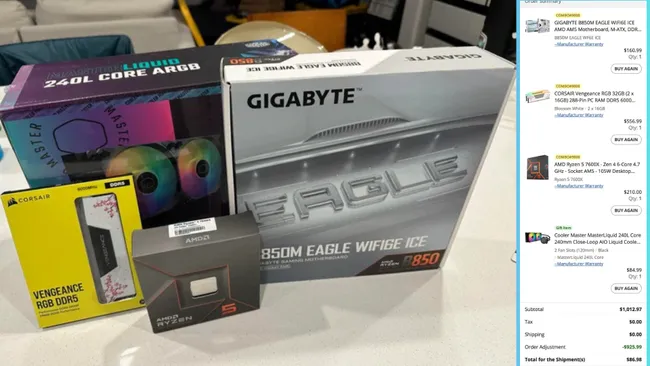 Сначала в корзине появились процессор Ryzen 5 7600X и материнская плата Gigabyte B850M Eagle. Оба товара уже продавались немного дешевле обычного. Затем покупательница добавила комплект памяти Corsair Vengeance RGB DDR5-6000 на 32 ГБ — и система показала неожиданную скидку в почти $800.