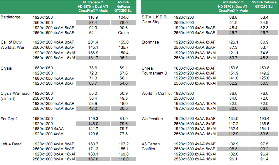 В целом, журналисты оценивают превосходство Radeon HD 5870 над GeForce GTX 285 в +5% - +155%, над GeForce GTX 295 от -25% до +95%. Младшее решение - Radeon HD 5850, оказывается быстрее GeForce GTX 285 на величину от -25% до +120%. Закончим знакомство с уровнем производительности новинок тремя слайдами неизвестного происхождения:
