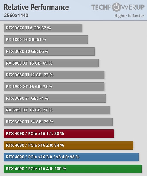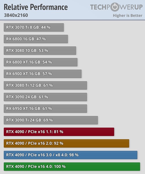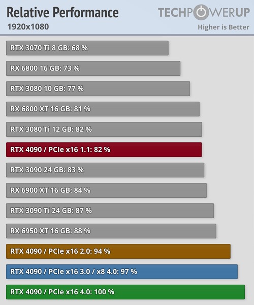 Пока компьютерное сообщество с интересом изучает результаты тестов топового графического адаптера NVIDIA GeForce RTX 4090, некоторые энтузиасты резонно интересуются, какая версия интерфейса PCIe должна использоваться для раскрытия потенциала GeForce RTX 4090: специалисты ресурса TechPowerUp решили ответить на животрепещущий вопрос, протестировав новинку с задействованием PCIe разных версий.