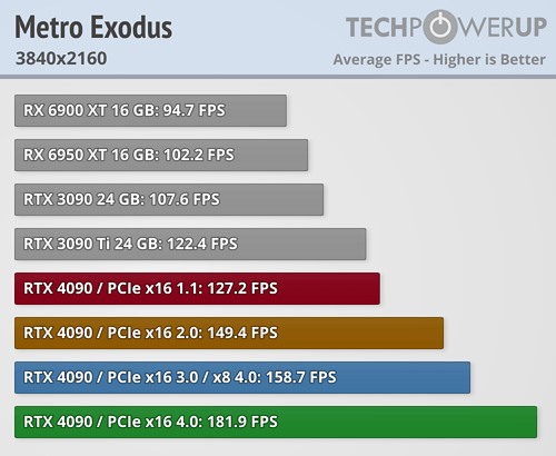 Единственным исключением стал тайтл Metro Exodus, который болезненно отреагировал даже на использование PCIe 3.0 вместо PCIe 4.0, что стало причиной ощутимого снижения fps, особенно в 4K (на 14.6 %), не говоря уже про предыдущие версии.
