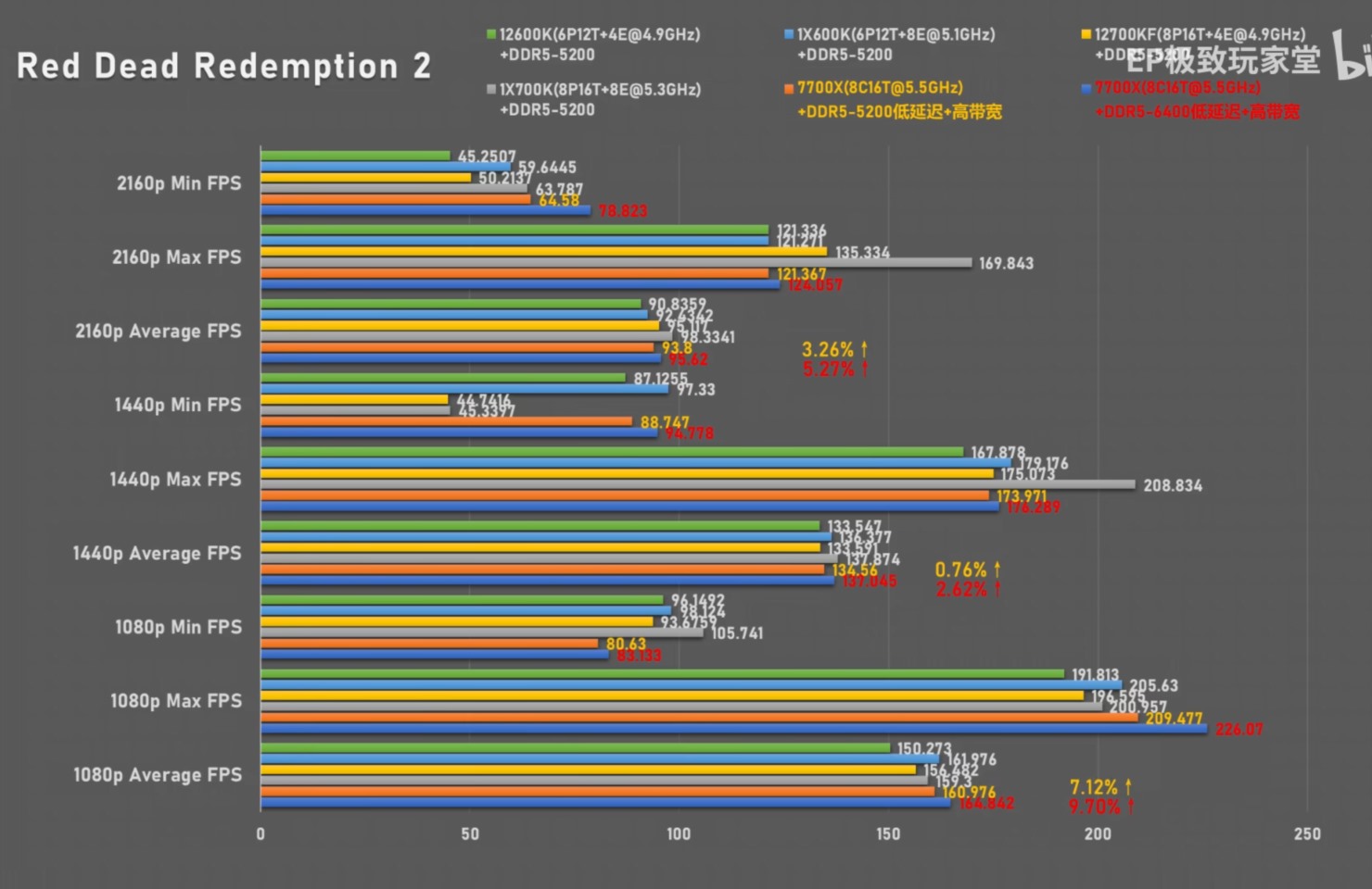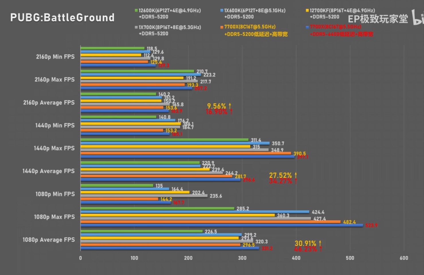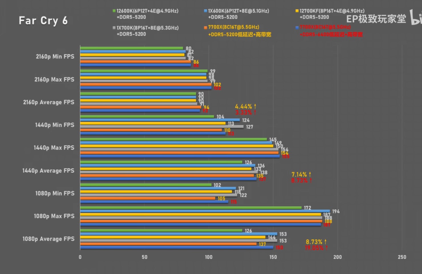 Использование же DDR5-6400 в дуэте с Ryzen 7 7700X даёт ощутимый рост производительности, что позволяет модели от AMD ещё больше оторваться от своих соперников: в Counter-Strike: Global Offensive преимущество над Core i7-13700K и Core i5-13600K в 1080p составляет уже 8.1 и 10.8 %, в PUBG: BATTLEGROUNDS — 3.4 и 10.7 %, в NARAKA — 10.1 и 6.2 %, в Apex Legends — 1.2 и 9.2 %, в Red Dead Redemption 2 — 3.5 и 1.8 %, а в Horizon Zero Dawn — 7.3 и 10.3 % соответственно.