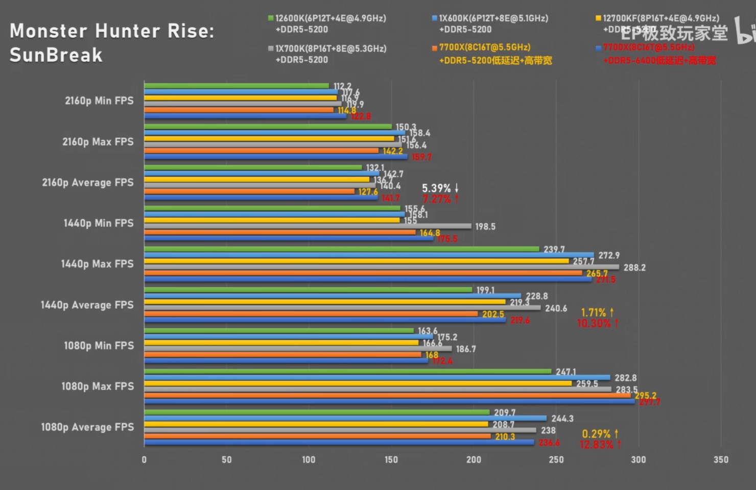 Впрочем, в ряде игр Ryzen 7 7700X даже в дуэте с модулями оперативной памяти DDR5-6400 не смог побороть Core i7-13700K и Core i5-13600K: в разрешении 1080p по среднему fps процессор «красной команды» уступил своим соперникам в Monster Hunter Rise: Sunbreak (на 0.6 и 3.2 %) и Far Cry 6 (на 2.0 %).