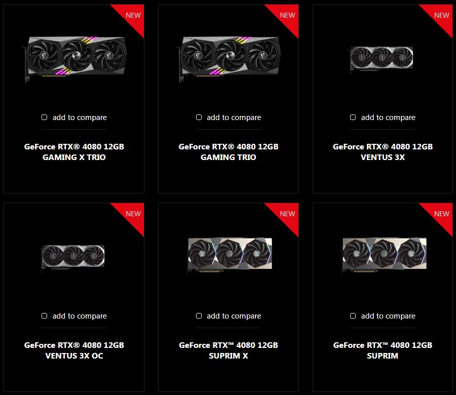 Как сообщает ресурс VideoCardz, производитель MSI ранее разместил на своём официальном сайте сразу несколько моделей GeForce RTX 4080 12 Гбайт, и на момент написания материала они до сих пор присутствуют.