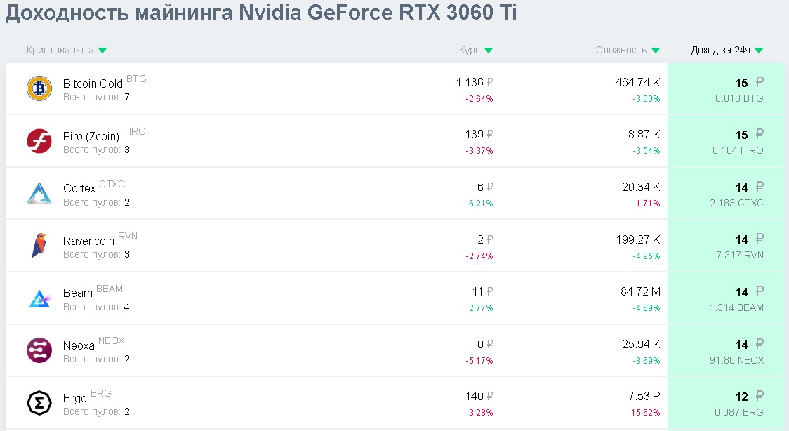 Если ранее доходность была в районе 18 в сутки, что собственно на уровне затрат на электроэнергию, то уже сегодня RTX 3060 Ti за 24 часа даст всего лишь 15 рублей, уже даже ниже затрат на электричество. А ведь это одна из самых энергоэффективных видеокарт, значит другие модели показывают еще худшее соотношение.
