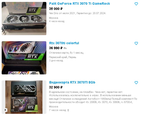 И вот на этом фоне мы можем наблюдать как стремительно падают цены на вторичном рынке. Субфлагманские RTX 3070 Ti можно найти уже дешевле 33 тысяч рублей, данная модель позволит играть в любые игры на максимальных настройках графики. Из минусов у данной модели всего 8 ГБ видеопамяти, и в добавок горячей GDDR6x. Сам факт, ранее в начале месяца данные модели продавались от 40 тысяч рублей, цены пока что продолжают падать.