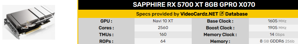 Карта построена на базе графического процессора Radeon RX 5700 XT на кристалле Navi 10. Эта модель имеет 40 вычислительных блоков с 2560 потоковыми процессорами. Модель Sapphire GPRO оснащена 8 ГБ памяти стандарта GDDR6, работающей на скорости 14 Гбит/с. Что касается частоты графического процессора, то GPRO X070 имеет эталонные характеристики, установленные компанией AMD - 1607/1755/1905 МГц для базовой, игровой и повышенной частоты соответственно. Тот факт, что у этой карты есть игровые частоты, указанные в официальных спецификациях, может показаться странным, учитывая, что карта предназначена для профессиональных нагрузок, но технически это просто кастомная Radeon RX 5700 XT.