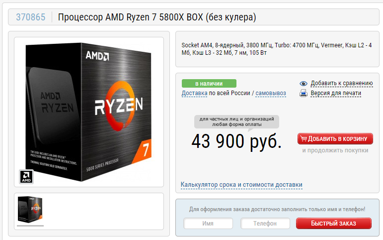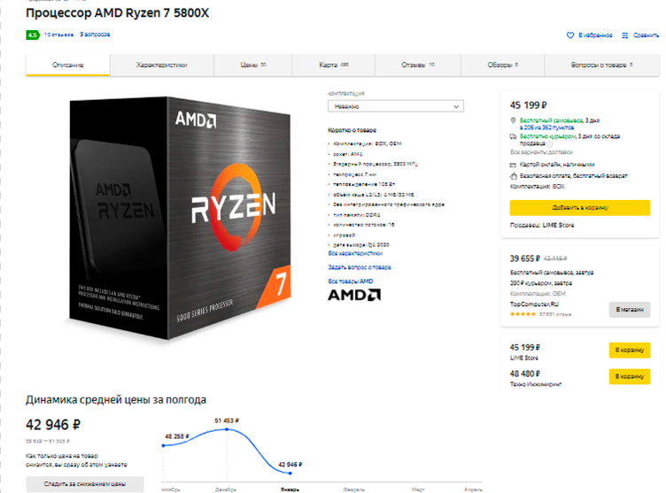 Гораздо интереснее выглядит 8-ядерный Ryzen 7 5800X, который всего на 3 тысячи дороже рекомендаций AMD, что делает его отличным выбором для построения высокопроизводительного игрового ПК. Стоит отметить, что, согласно ЯндексМаркету, только за последнее время он подешевел на 6 000, а кое-где даже на 9 тысяч рублей.