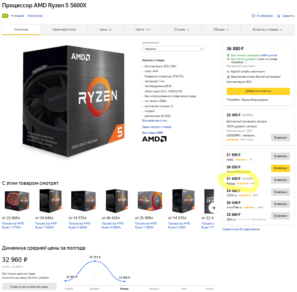 Давайте сравним рекомендованные цены, которые были установлены на момент старта продаж новых процессоров в РФ, с теми, что доступны сегодня. Итак, официальная стоимость Ryzen 5 5600Х составляет 27 400 рублей. К сожалению, за всё время мы ни разу не видели в рознице данный камень по такой стоимости. Сегодня его можно купить в Регарде за 31 400 рублей, а значит переплата составит всего 4 тысячи.