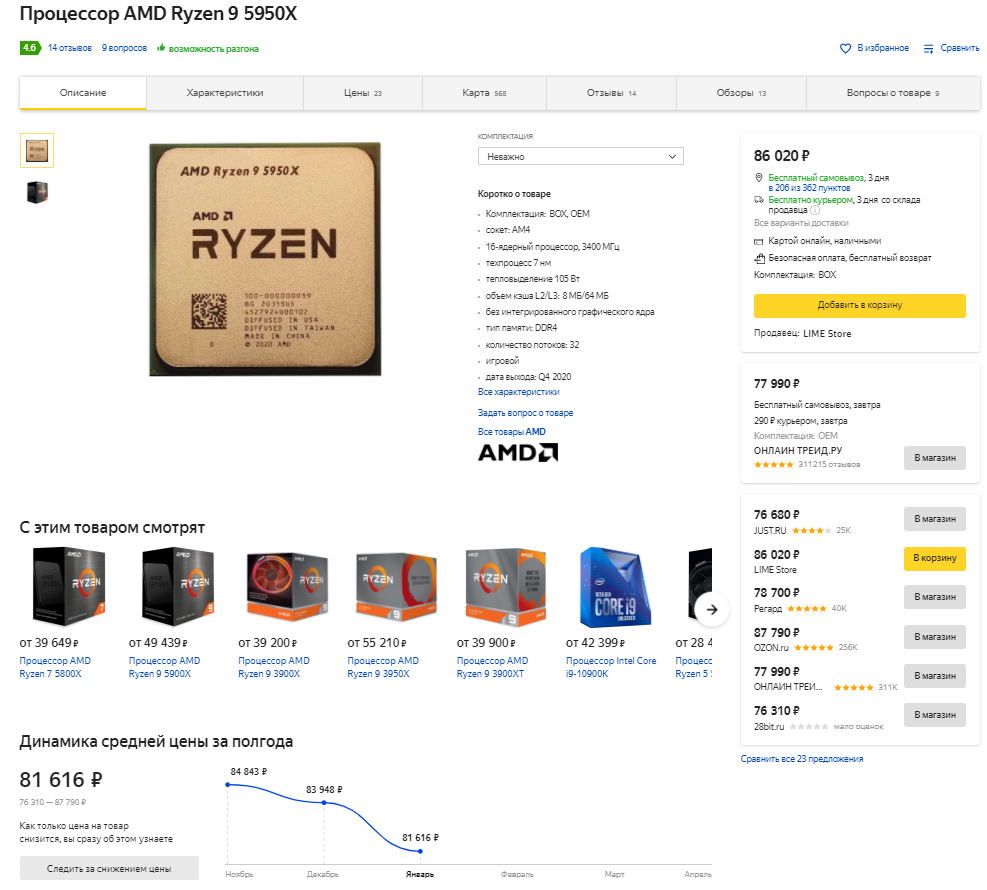 Флагман текущей линейки Ryzen 9 5950X неповоротливо движется в сторону снижения цены. Пока тенденция слишком медленная, но ЯндексМаркет утверждает, что в Регарде цена уже упала на 6 тысяч рублей, если говорить о средних показателях по рынку.
