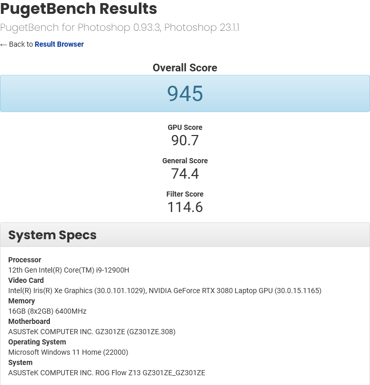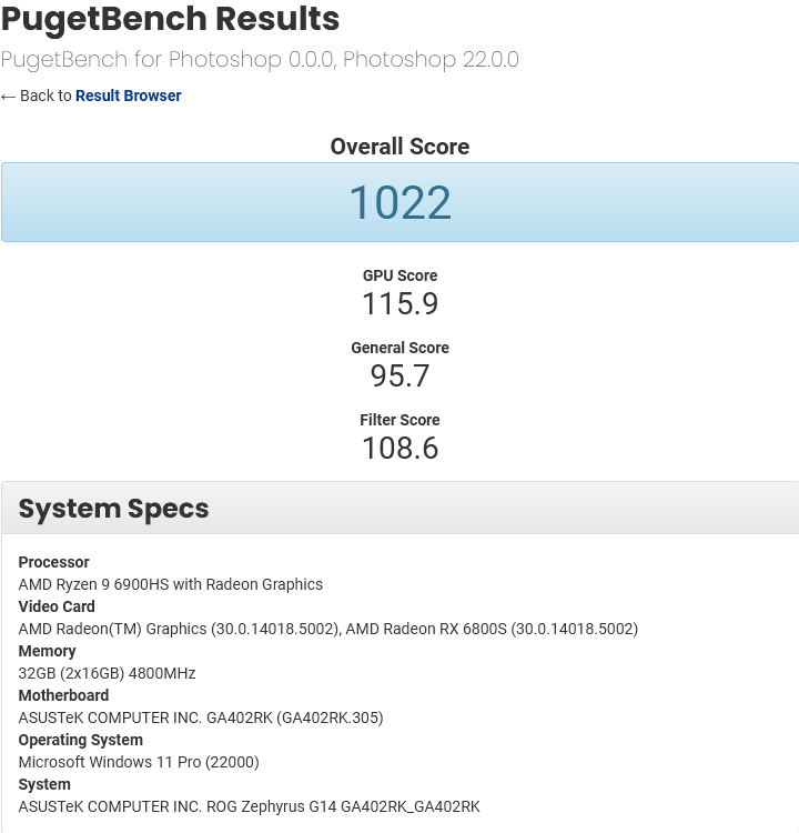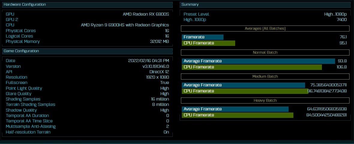 Исходя из представленных данных, мобильный процессор AMD Ryzen 9 6900HS в паре с графическим адаптером Radeon RX 6800S при задействовании пресета High_1080p смог набрать 7400 баллов, что на фоне соперников из противоборствующих лагерей выглядит вполне неплохим результатом: например, 8-ядерный 16-поточный Core i9-11900H в дуэте с мобильной GeForce RTX 3070 при аналогичных условиях набирает всего 6100 баллов.