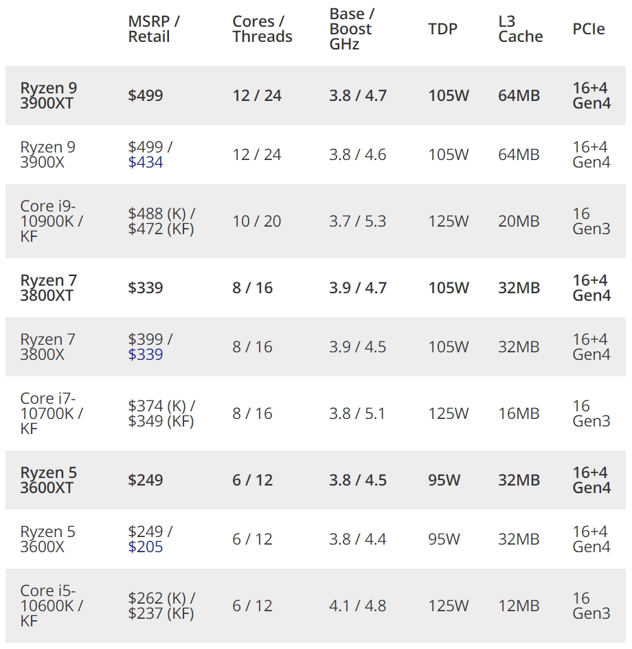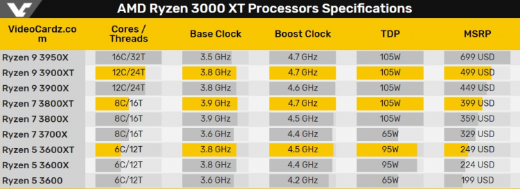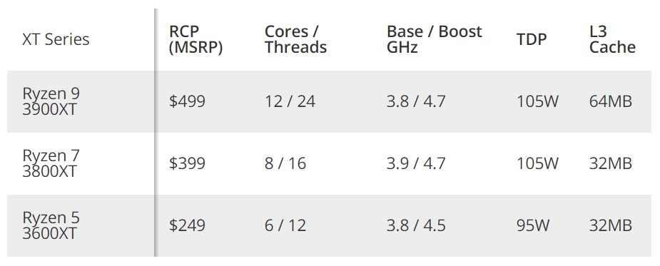 AMD выпускает три новых процессора Ryzen 3000 серии XT, которые стали ведущими чипами для семейств Ryzen 9, Ryzen 7 и Ryzen 5. Новые процессоры имеют тот же 7-нм процесс и архитектуру Zen 2, количество ядер и потоков, емкость кэш-памяти L3 и мощность TDP, но при этом обеспечивают дополнительные 100–200 МГц по сравнению со стандартными моделями. В отличие от стандартной практики AMD модели Ryzen 9 3900XT и Ryzen 7 3800XT поставляются без комплектных кулеров, а Ryzen 5 3600XT с комплектным кулером Wraith Spire.