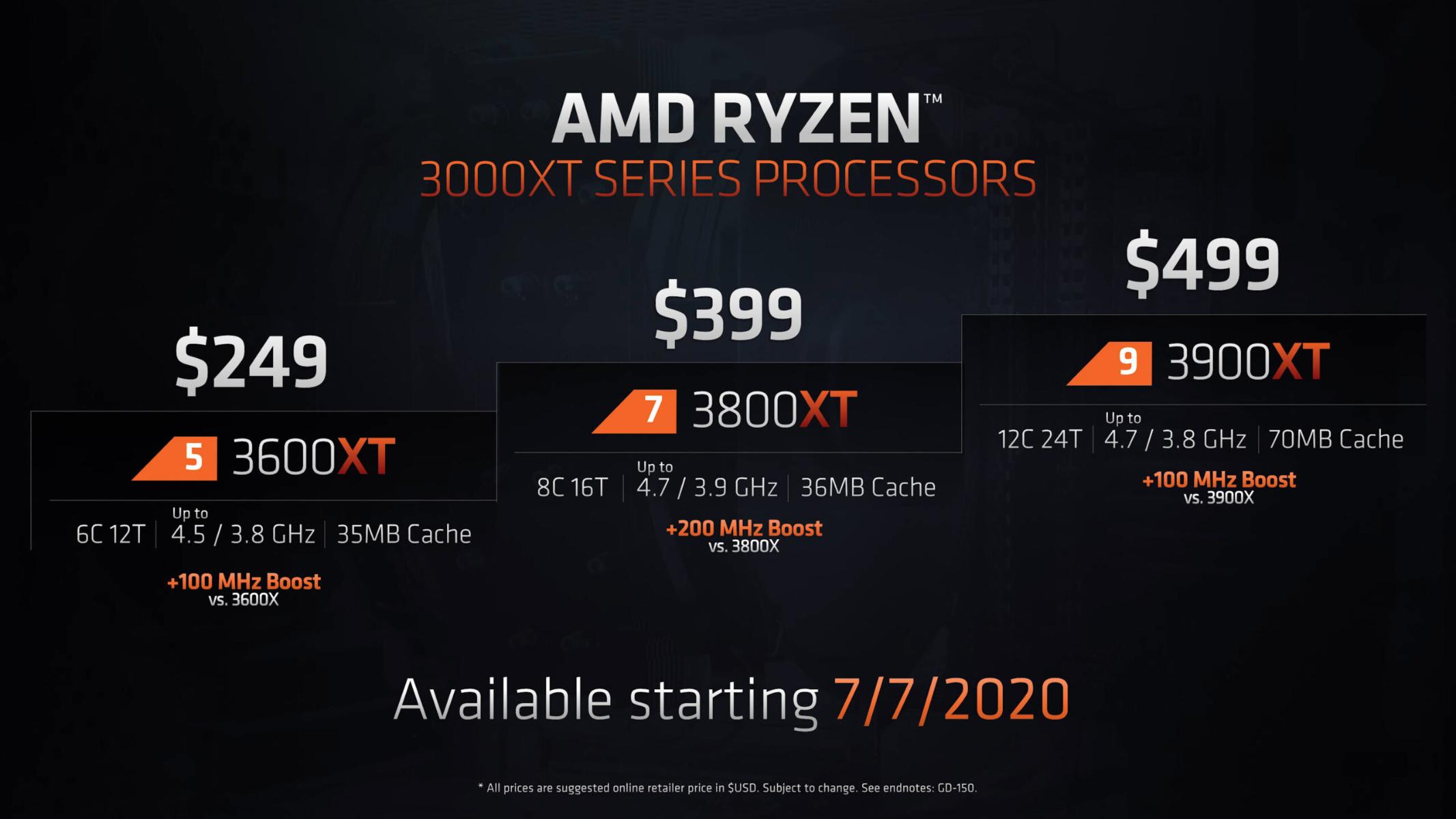 Процессоры серии XT станут общедоступными 7 июля 2020 года. AMD также объявила о том, что новый чипсет B550, который обеспечивает расширенные возможности интерфейса PCIe 4.0 доступен во всем мире. К нему присоединится чипсет A520, который дебютирует с более сорока моделями плат с сокетом AM4 в августе 2020 года.