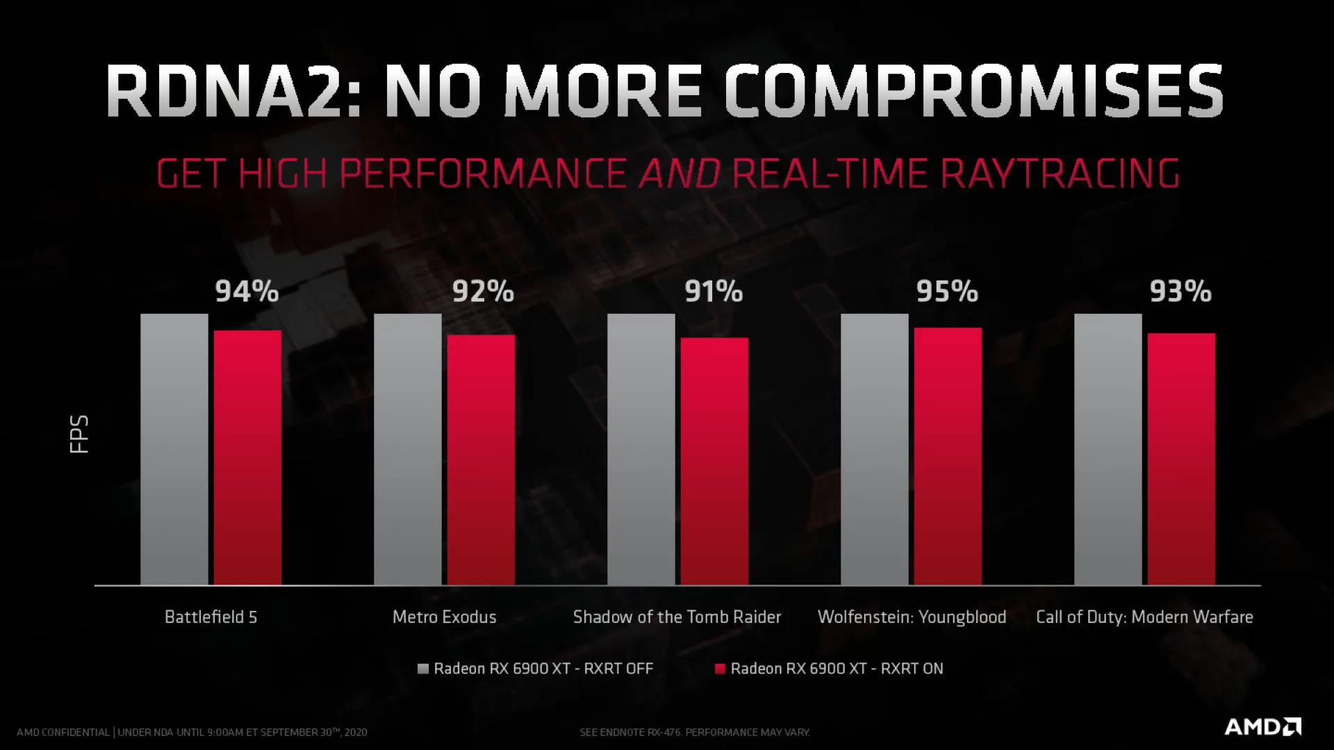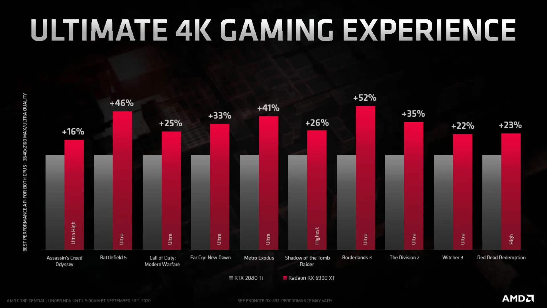Ещё по представленным слайдам можно сделать вывод, что новинка будет превосходить по производительности RTX 2080ti в среднем на 30% (от 16 до 52% в зависимости от проекта). Ещё одним немаловажным плюсом RX 6900XT станет минимальное уменьшение перформанса при включённом алгоритме трассировки лучей.
