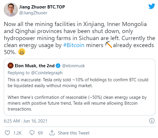 За несколько последних недель наши читатели привыкли к плохим новостям о рынке криптовалют. Китайское правительство занимается активным прессингом местных майнеров, а ситуация накалилась настолько, что бедолаги готовы переехать куда-угодно. Дошло до того, что некоторые начали присматриваться к Сальвадору и РФ, а ведь в шаге есть Казахстан с его запасами углеводородов и Индия, где низкая цена электричества и дешёвая рабочая сила может обеспечить просто райские условия. 13 июня обстановку разрядил Илон Маск. Неясно, было ли ему просто скучно, либо миллиардер давно всё это спланировал, но после его твита курс Биткоина пополз вверх, обеспечив подъём всей криптовалюты.