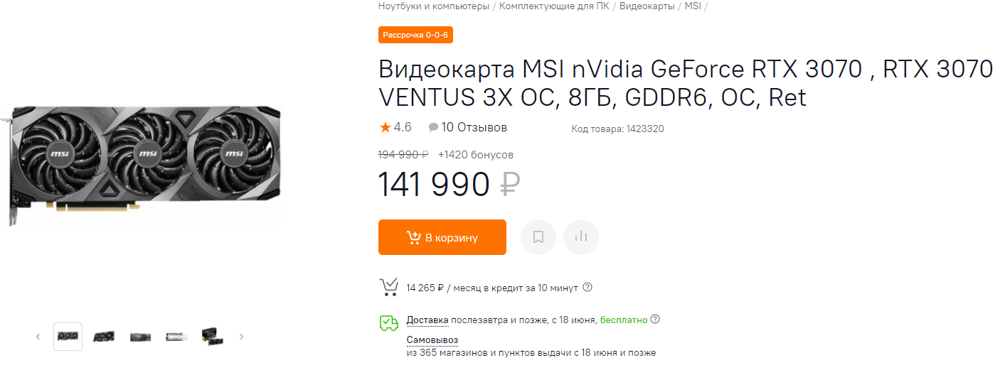 Поскольку выше были два предложения для геймеров, мы не можем забывать о майнерах. Возможно, кто-то из них решит воспользоваться снижением цены на GeForce RTX 3070. Надеемся, что эти ребята знают, что модель с приставкой «Ti» имеет сниженный хешрейт, а значит не подходит для создания фермы. Самый бюджетный вариант представлен видеокартой производства Palit. Цена игрушки для майнеров составила 140 990 рублей, а скидка доходит до 55 000. Как вариант можно взять карточку производства MSI. Она всего на тысячу дороже и предлагает небольшой буст. Есть мнение, что видеокарты Palit лучше в ферму не ставить. Мы категорически с этим несогласны, но решать вам.