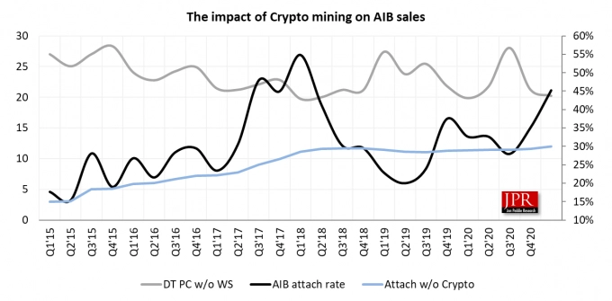 В сети появилась информация о влиянии повышенного интереса к майнингу криптовалют на рынок видеокарт. Согласно данным Jon Peddie Research, четвертая часть всех проданных видеокарт за первые три месяца текущего года оказалась у приверженцев майнинга и спекулянтов. В количественном выражении это составляет около 700 тысяч видеокарт среднего и высокого ценового диапазона. Если сложить их стоимость, то получается немалая сумма, достигающая порядка половины миллиарда вечно зеленых американских денежных знаков. Таким образом, обычные пользователи, покупающие видеокарты для их непосредственного применения не досчитались большого количества устройств в магазинах, что привело к невероятному росту стоимости графических ускорителей.