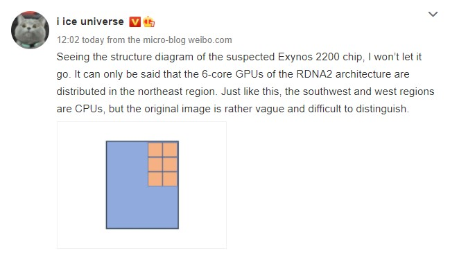В ожидании официальных новостей о Samsung Exynos 2200 приходится довольствоваться крупицами информации от инсайдеров. Совсем недавно IceUniverse раскрыл кодовые имена Exynos 2200 и встроенной в него графики от компании AMD. Теперь в руки энтузиаста попала документация, содержащая структурную схему Exynos 2200. Как отмечает IceUniverse, копия, находящаяся в его распоряжении, плохого качества, но достаточного, чтобы понять количество вычислительных блоков.
