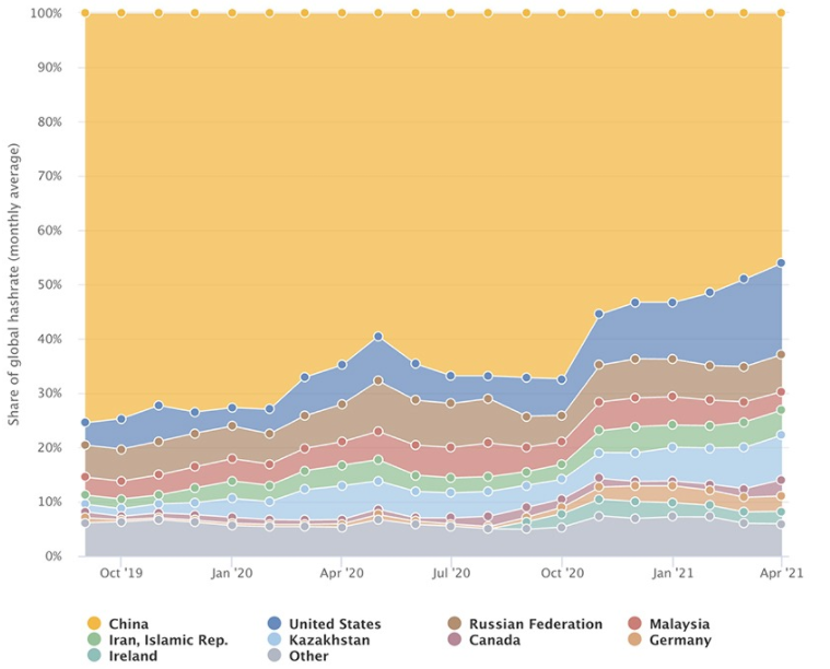 В начале октября 2019 года китайские майнеры генерировали 75% всех Биткоинов планеты. За следующий год активно увеличивалась активность российских и американских шахтёров, а китайские напротив теряли процент за процентом. По сути, именно с октября 2020 стали заметны первые признаки готовящейся миграции, когда власти Поднебесной только начали теснить местных фермеров по всем фронтам. К марту 2021 года Китайские майнеры потеряли лидирующие позиции, а их доля в сети Биткоина упала ниже 50%. Ниже можно рассмотреть данные, собранные исследователями из Кембриджского университета. Увы, результатов последних месяцев нет, но даже эта информация позволяет понять, что исход начался задолго до первых майских запретов.