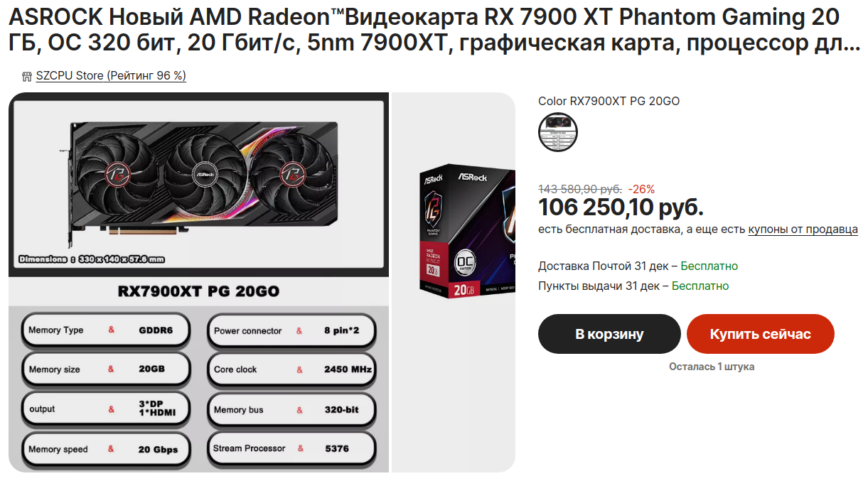 Однако, из-за малого количества самих видеокарт на базе чипов NAVI 31, а также из-за "эффекта новизны", стоимость первых экземпляров, доступных для покупки гражданам РФ с минимумом дополнительных препятствий, в рублевом выражении взлетела более, чем на 80%.
