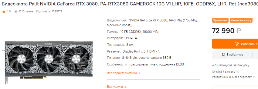 Ну и GeForce RTX 3080 за 76 тысяч – это настоящий грабёж средь бела дня. В какой-то момент цена на этот графический чип опускалась до 60 тысяч рублей, ну а сегодня впору закрыть страницу с товаром, ведь нет никаких поводов переплачивать за GeForce RTX 3080 больше 15 тысяч рублей. Такое удорожание никак нельзя привязать к падению курса рубля, поэтому мы полагаем, что это самое худшее предложение из нашего списка на сегодня.