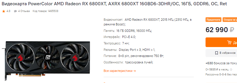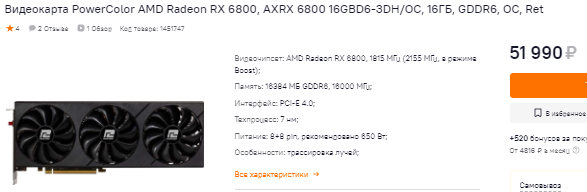 Почти не подорожала Radeon RX 6800. Пару дней назад за видеокарту просили 49 тысяч рубликов, а здесь у нас просят заплатить всего 53 тысячи. Можно сделать вывод, что магазин не делал пересчёт в долларах по курсу, а просто поднял цены в ручном режиме. Это значит, что отдельные модели и графические чипы будут более привлекательные, а некоторые стоит обходить стороной.