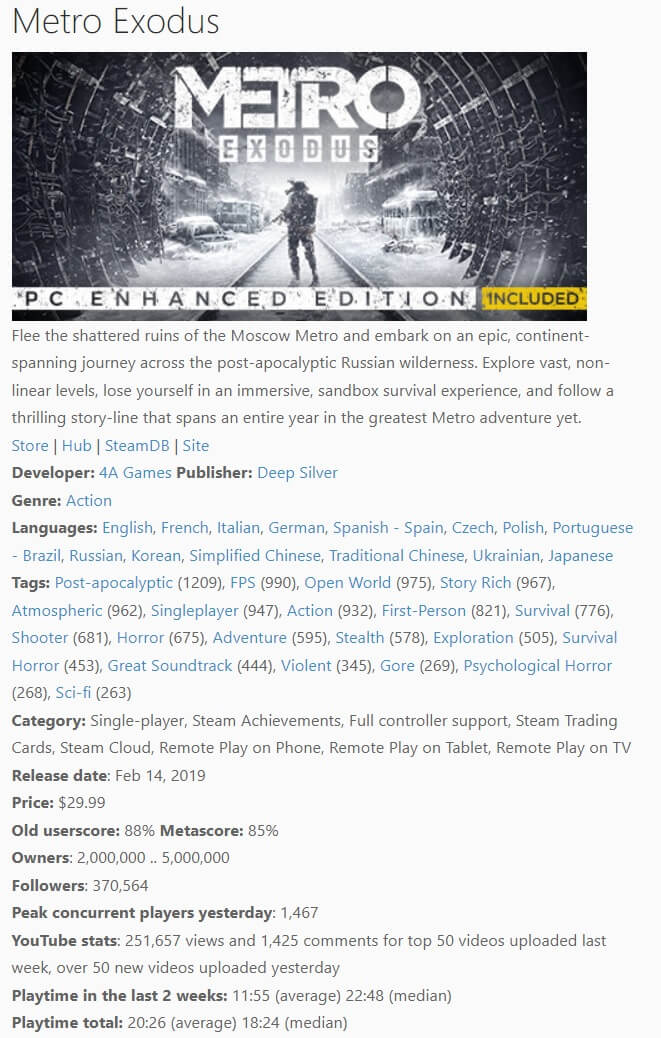 Embracer Group объявила, что Metro Exodus продано более 6 миллионов копий по всему миру на всех платформах. Metro Exodus вышла в феврале 2019 года, то есть для того, чтобы пройти этот шестимиллионный рубеж, потребовалось три года.