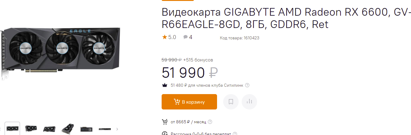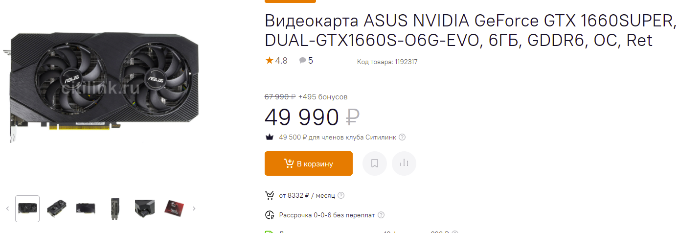 В последнее время наблюдается сильное падение цен на серию GeForce GTX 1660 Ti/SUPER. Это уже привело к тому, что майнеры начали присматриваться к GPU, ведь вернуть вложения в новые фермы стало гораздо проще, чем было ещё неделю назад. Как видите, карта производства ASUS стоит 50 тысяч рублей и предлагается по скидке в 18 000, что довольно много. Играть в разрешении 4К GeForce GTX 1660 SUPER вам не позволит, а вот стабильные 60 кадров в секунду в 1080р на высоких настройках графики обеспечит.