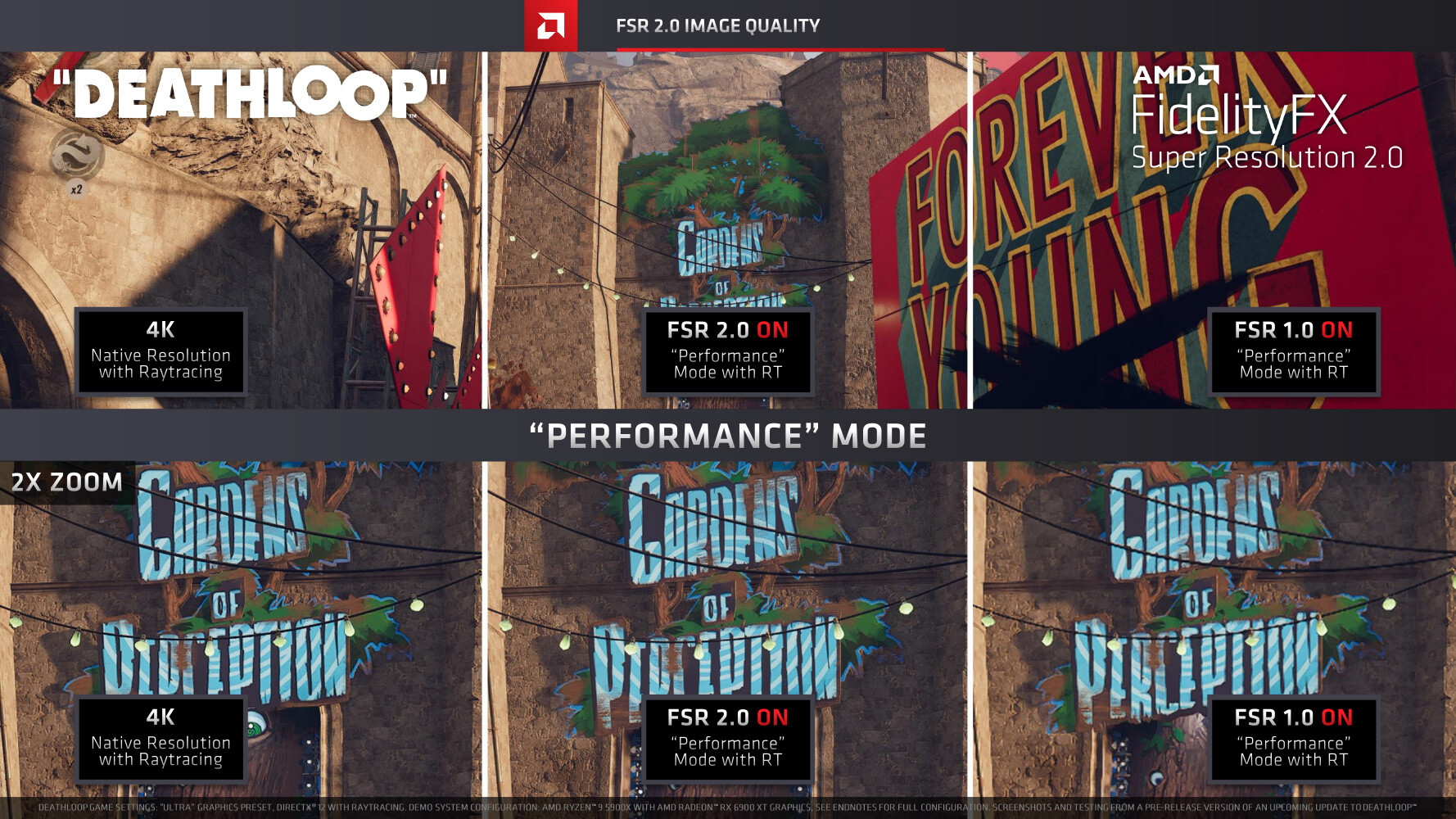 Ожидается, что FSR 2.0 станет доступен во втором квартале 2022 года, Deathloop — первая игра с поддержкой данной технологии. Компания уже продемонстрировала, на что способен FSR 2.0 в этом проекте от Arkane Studios и Bethesda, попробовать оценить результат можно на опубликованном видео. Хотя это далеко не лучший способ сравнения, учитывая сжатие YouTube, но изменения заметны, особенно в некоторых кадрах: можно обратить внимание на более чёткие края у надписей и текстуры в случае с FSR 2.0. Более качественное сравнение опубликовано в блоге AMD Community, там уже можно взглянуть на снимки в 4K разрешении размером более 2 МБ. Больше подробностей расскажут на конференции GDC 2022 ближе к концу этого месяца.