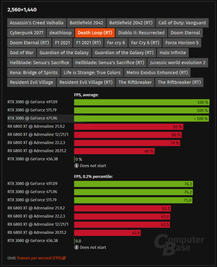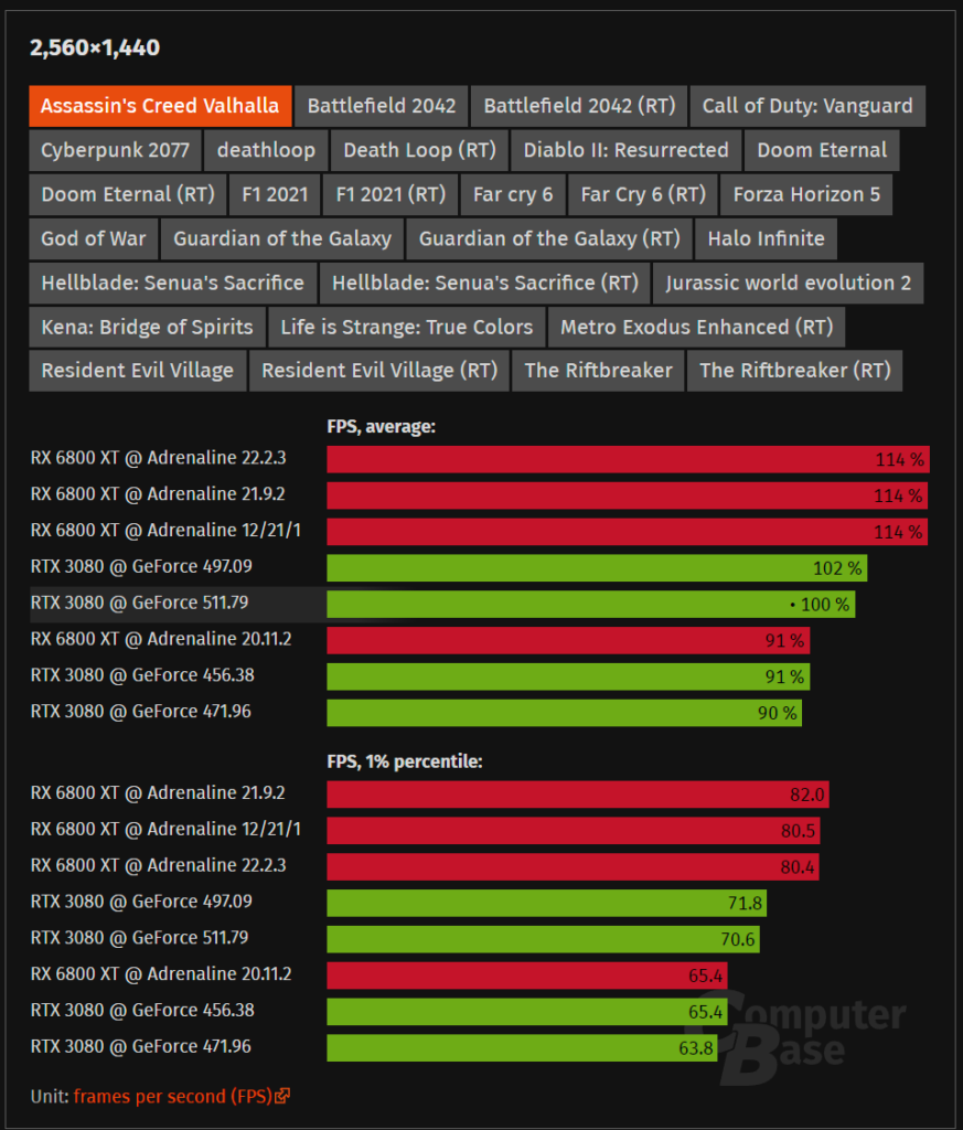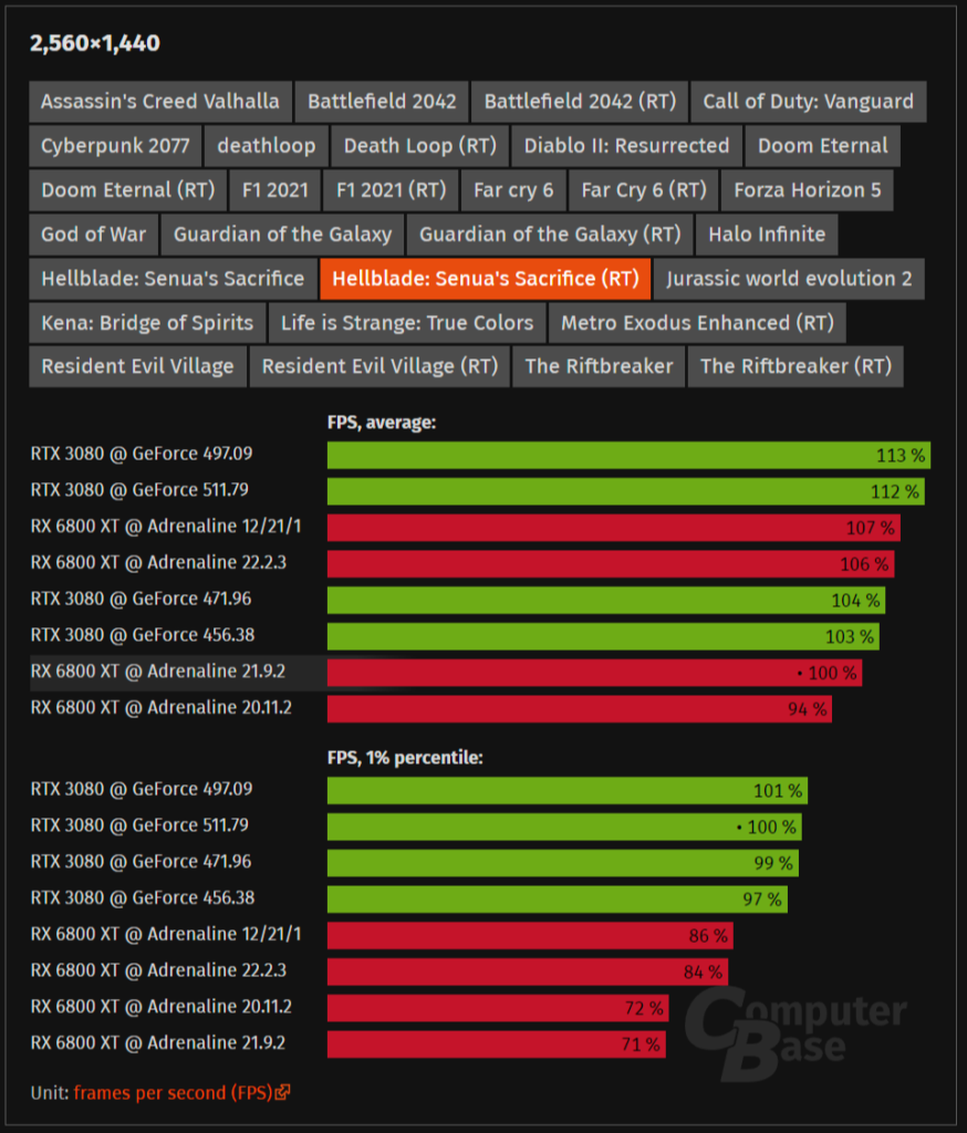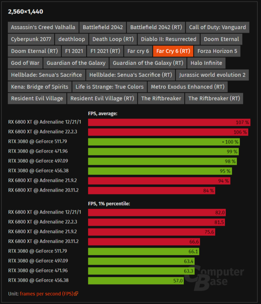 Известно, что большая часть рынка принадлежит NVIDIA, а многие наши читатели уверяют, что драйверы AMD грешат постоянными проблемами. Неясно, встречались ли они сами с этими проблемами, или слышали об их существовании от знакомых. В любом случае народ об этом говорит, поэтому создаётся ощущение, что видеокарты Radeon RX 6000-й серии грешат целым ворохом неприятных сюрпризов. Сегодня поспорить с диванными аналитиками решили журналисты сайта ComputerBase. Они провели масштабное тестирование, в результате которого выяснилось, что видеокарты AMD последнего поколения за более чем год после релиза стали значительно быстрее в играх. Случилось это благодаря постоянному улучшению драйверов, а результаты получены после сравнения тестового программного обеспечения на момент релиза и на 16 марта.