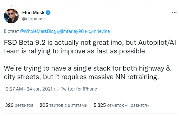 Просочившаяся в прошлом году информация свидетельствовала о том, что Маск сильно преувеличил утверждение о том, что Tesla приблизилась к "святому Граалю" возможностей автономного вождения - автономии пятого уровня. Однако затем Маск опубликовал в Твиттере пост о том, что "FSD Beta 9.2 на самом деле не очень хороша, но команда Autopilot/AI стремится улучшить ее как можно быстрее". Как говорится, время рассудит, но, возможно, Tesla захочет обновить политику компании относительно социальных сетей, добавив в них пункт, гласящий "никаких чрезмерных обещаний".