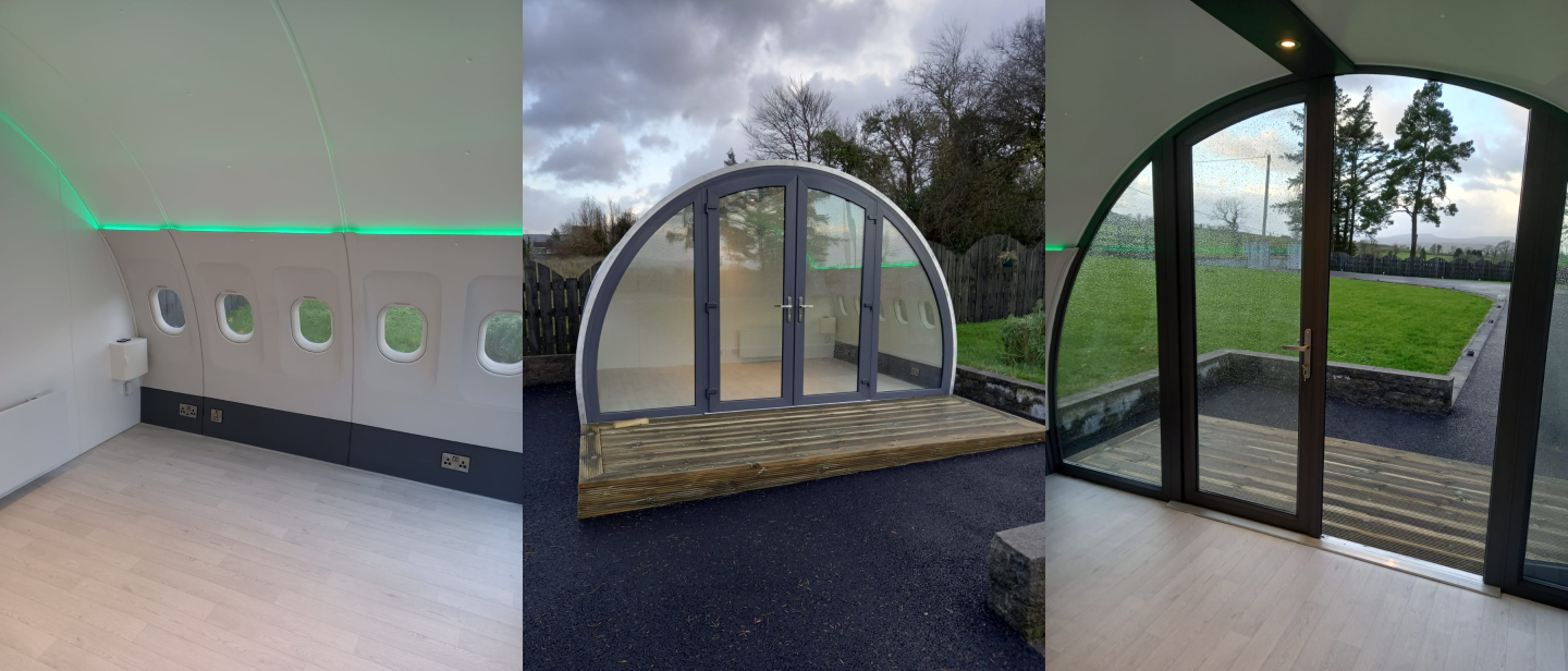 Специалисты компании берут высококачественные секции изолированного фюзеляжа и оборудуют из них небольшие офисы, сараи, игровые комнаты или глэмпинг-капсулы: двери с двойным остеклением с одной стороны, стены с другой, чистовой теплоизолированный пол, деревянный настил и практически все остальное, что пожелает клиент, например, розетки, отопление/воздух, цветное светодиодное освещение и тому подобное.