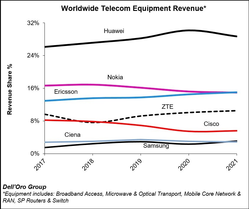 Всего, помимо Huawei, можно отметить еще шесть крупных мировых поставщиков оборудования, которые в совокупности занимают около 80% мирового рынка телекоммуникаций.