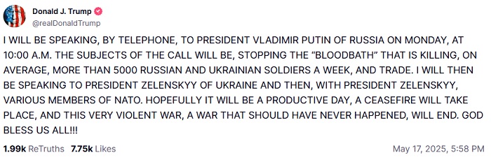 С американской стороны инициатива уже озвучена. Дональд Трамп, занимающий пост президента США второй срок, накануне заявил, что намерен поговорить с российским лидером в ближайший понедельник в 17:00.