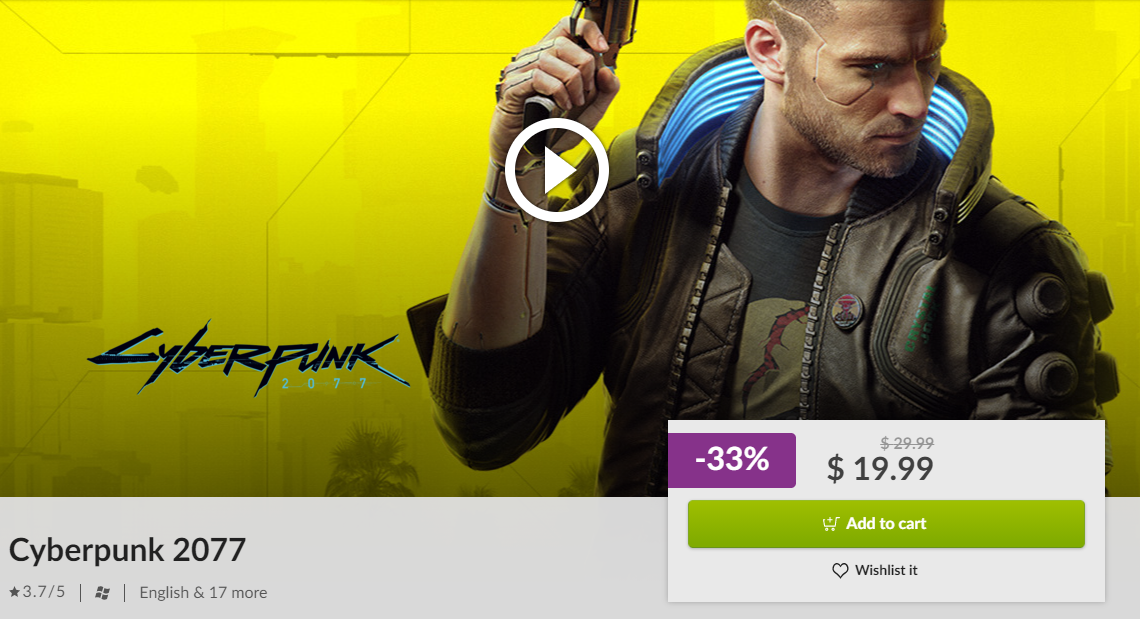 Проблема в том, что абсолютно все, кто хотел, давно купили серию игр Ведьмак, поэтому смысла брать коллекцию для многих просто нет смысла, а вот отдельно Cyberpunk 2077 – это отличный шанс сэкономить, ведь сегодня игра доступна за 19.99 доллара, или 1399 рублей. В данном случае стоит понимать, что в конце 2020 года Cyberpunk 2077 стоила в GOG 40 долларов, а значит перед нами двукратное падение цен. Кстати, если вы брали игру в Steam, то платили за неё 60 долларов, а значит сегодня есть возможность купить её в 3 раза дешевле. Посмотреть другие скидки можно по ссылке. Там достаточно интересных предложений. К примеру, Metro Exodus - Gold Edition потеряла 66% и стоит всего 10.19 доллара.