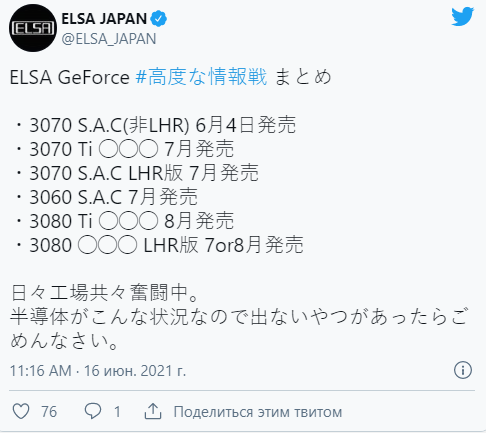 Поскольку сама NVIDIA говорила о выходе подобных видеокарт во 2 квартале, многие подумали, что это будет май, ну или хотя бы начало июня. Как оказалось, всё куда драматичнее, ведь один из производителей озвучил точные сроки, пояснив задержки сложностями с доступностью графических чипов. Информация пришла от японской ELSA. Это не самая большая компания в мире, но на отечественном рынке она занимает немалую долю продаж. Итак, GeForce RTX 3070 появится в июле, а значит геймерам придётся ещё какое-то время смириться с высокими ценами, а у майнеров есть шанс купить её, пока доступны скидки. Очевидно, что через несколько месяцев в продаже останутся только LHR-версии, а значит выбора у шахтёров просто не будет. На июль назначен выпуск GeForce RTX 3060 с заблокированным хешрейтом, а вот GeForce RTX 3080 появится только к концу лета. Часть партии ожидается в июле, но она может быть перенесена или отложена на август.