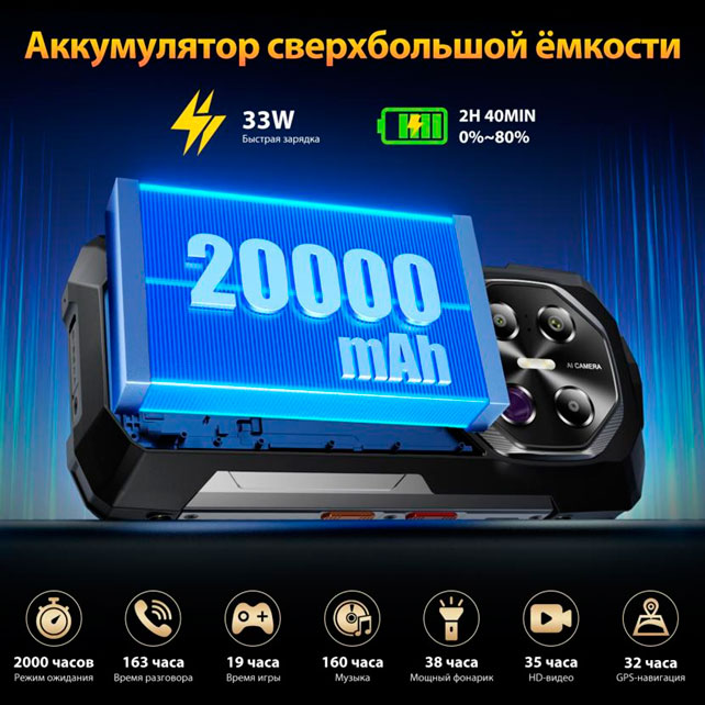 Модель Armor 33 Pro с таким же аккумулятором 25 500 мАч обладает находящимся на обратной стороне вспомогательным экраном с диагональю 3,4 дюйма. В число остальных характеристик входят динамик громкостью 118 дБ, способный заглушить любой окружающий шум, и RGB-стробоскоп Infinite Halo 2.0. Это устройство доступно покупателям за $579,99 или 479,99 евро.