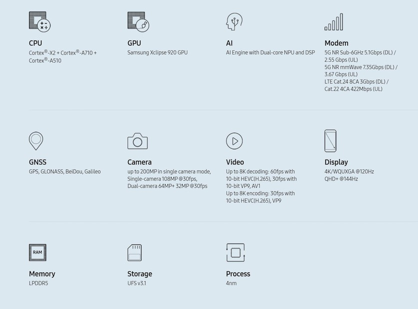 Что касается Exynos 2200, Samsung утверждает, что модернизированный NPU удвоил производительность по сравнению с его предшественником. Exynos 2200 поставляется с модемом 3GPP Release 16 5G. Заявленная максимальная скорость составляет 7,35 Гбит/с при загрузке в mmWave, но с функцией E-UTRAN New Radio — Dual Connectivity (EN-DC) модем может увеличить скорость до 10 Гбит/с за счет использования сигналов 4G LTE и 5G NR.