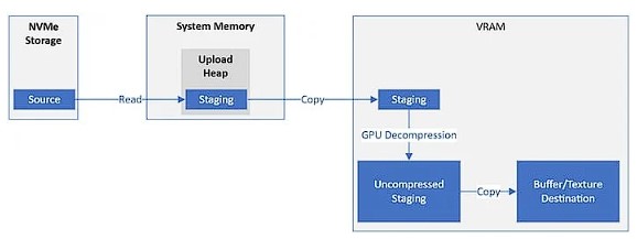 В этом тесте проверяется функция декомпрессии графического процессора DirectStorage. Вместо многоэтапного процесса отправки данных из хранилища в ЦП, распаковки их там и последующей отправки в ГП, DirectStorage 1.1 поддерживает возможность отправки их из хранилища в ОЗУ и ГП в сжатом виде перед распаковкой.