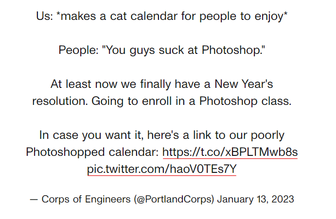 Инженерный корпус тихо выпустил календарь в конце прошлого года, но недавно он стал достоянием широкой общественности. Представители Портлендского округа написали о нем в Твиттере на прошлой неделе, в шутливом ответе на критику "плохо отфотошопленного" календаря. "По крайней мере, теперь у нас наконец-то есть новогодняя резолюция. Собираюсь записаться на курсы фотошопа", - написала группа.