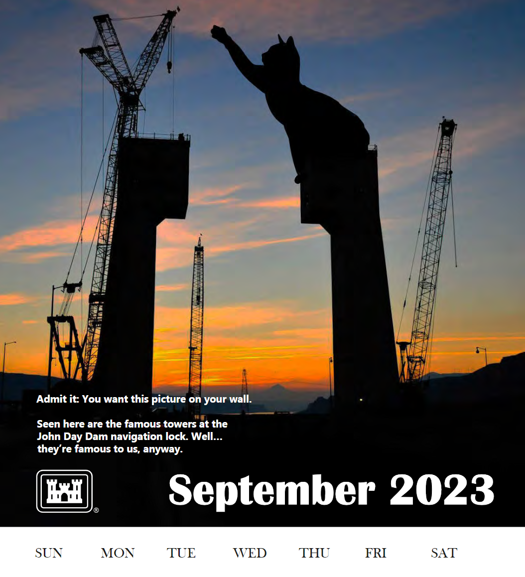 Календарь имеет обычные характеристики, с ежемесячной фотографией и датами внизу. На каждой фотографии изображен огромный кот, который лежит на оборудовании или нападает на него, или на ключевой объект инфраструктуры. Январь начинается с того, что кот использует плотину водохранилища Хиллс-Крик в Орегоне в качестве когтеточки. В июле кошка сидит на палубе корабля инженерных войск. Изображения сопровождаются комментариями о плотинах, гигантских кошках и их поведении.