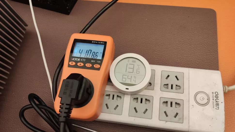 Согласно информации, предоставленной специалистом, тестирование проводилось в достаточно комфортных для оборудования условиях — температура окружающей среды составляла 13,6 °C при влажности в 64,4 %. При этом вся система потребляла около 411 Вт.
