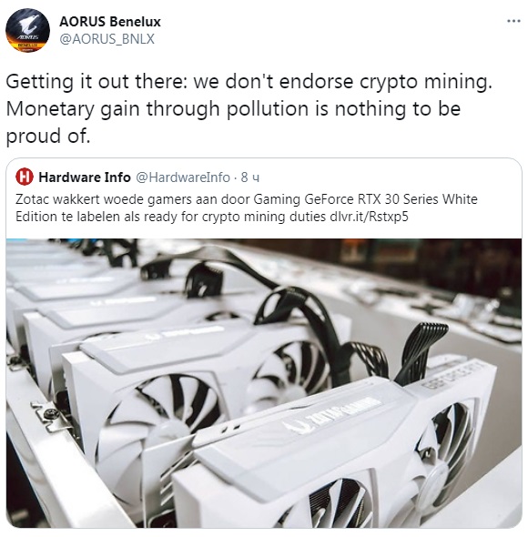 Впрочем, не все производители видеокарт поддерживают концепцию добычи криптовалют: в своём сообщении посредством Twitter представители бренда AORUS явно дали понять, что их отношение к майнингу крайне негативное, так как выгода в денежном эквиваленте связана с загрязнением (вероятно, окружающей среды), что ни в коем случае не может быть поводом для гордости.