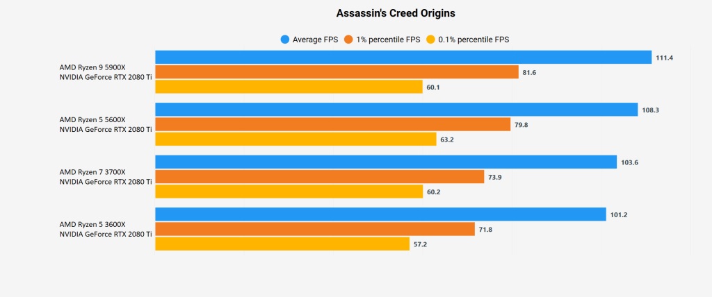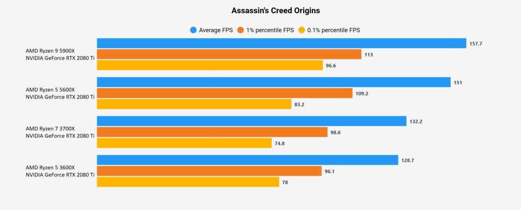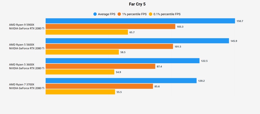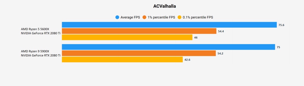 В тестах при разрешении 720p, которые, впрочем, интересны лишь с точки зрения оценки уровня производительности процессоров без упора в видеокарту, Ryzen 5 5600X в ряде игр сумел даже превзойти Ryzen 9 5900X, что объясняется тем фактом, что старший CPU содержит в себе два CCX-комплекса, в то время как младший полагается лишь на один. Исключением стала Assassin's Creed Valhalla, в которой 12-ядерной модели удалось оторваться от 6-ядерного CPU на 40.9 %.