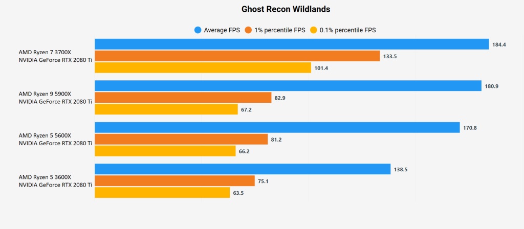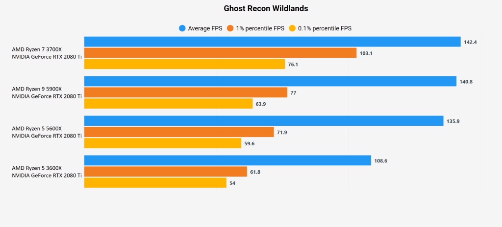 Примерно то же самое наблюдалось и в процессе соперничества между Ryzen 5 3600X и Ryzen 7 3700X, за исключением Ghost Recon Wildlands, где 8-ядерный CPU занял первую строчку, обогнав своего «соплеменника» на 31.1 %.