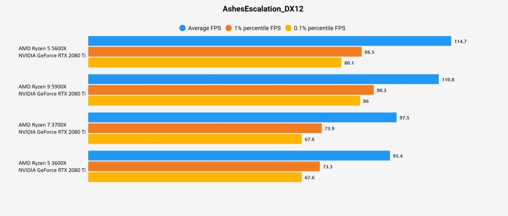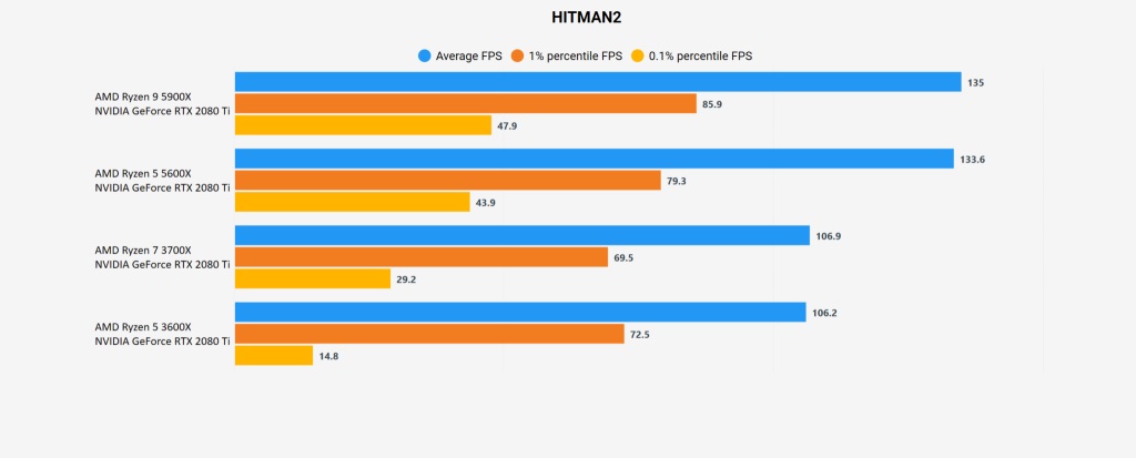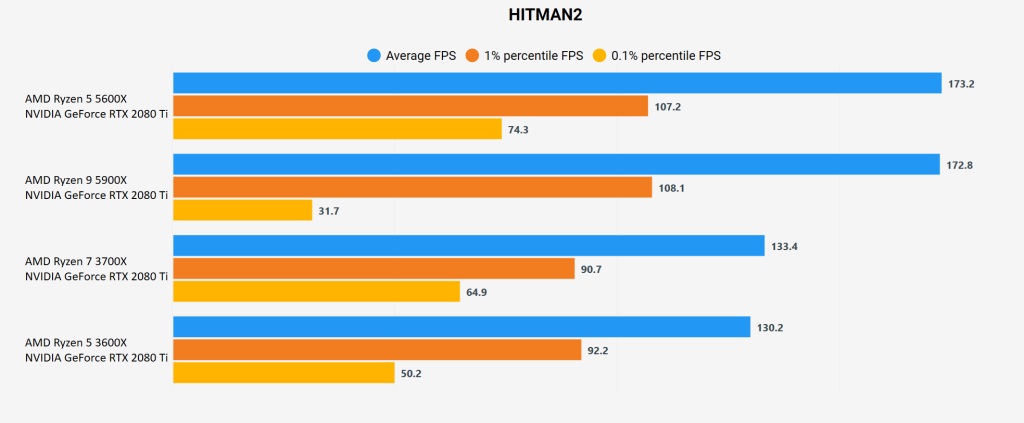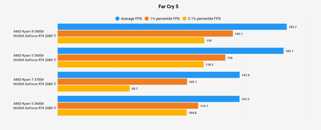 Результаты тестирования в семи современных игровых приложениях в разрешении 1080p продемонстрировали практически идентичный уровень производительности для обеих моделей семейства Vermeer: сколь-нибудь заметное преимущество в разрезе среднего значения кадровой частоты наблюдалось лишь в The Division 2, где Ryzen 9 5900X оторвался от Ryzen 5 5600X на 5.1 %, в то время как в остальных тайтлах разница варьировалась от 0 до 3,5 %.