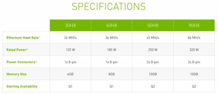 Как стало известно, NVIDIA решила устроить настоящую атаку на майнеров. Неясно, насколько всё это серьёзно, но уже вскоре в продажу поступит специальная линейка, ориентированная на создание ферм. Предполагается выпустить четыре модели, название каждой из которых примерно соответствует показателю хешрейта при добыче Эфира: CMP 30HX, 40HX, 50HX и 90HX. Известно, что первые две будут доступны уже в первом квартале текущего года, а последние две во втором. Давайте посмотрим на таблицу, где указано точное количество MH/s.