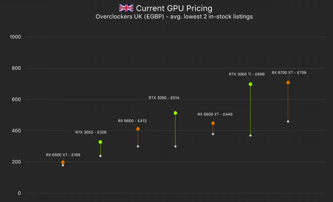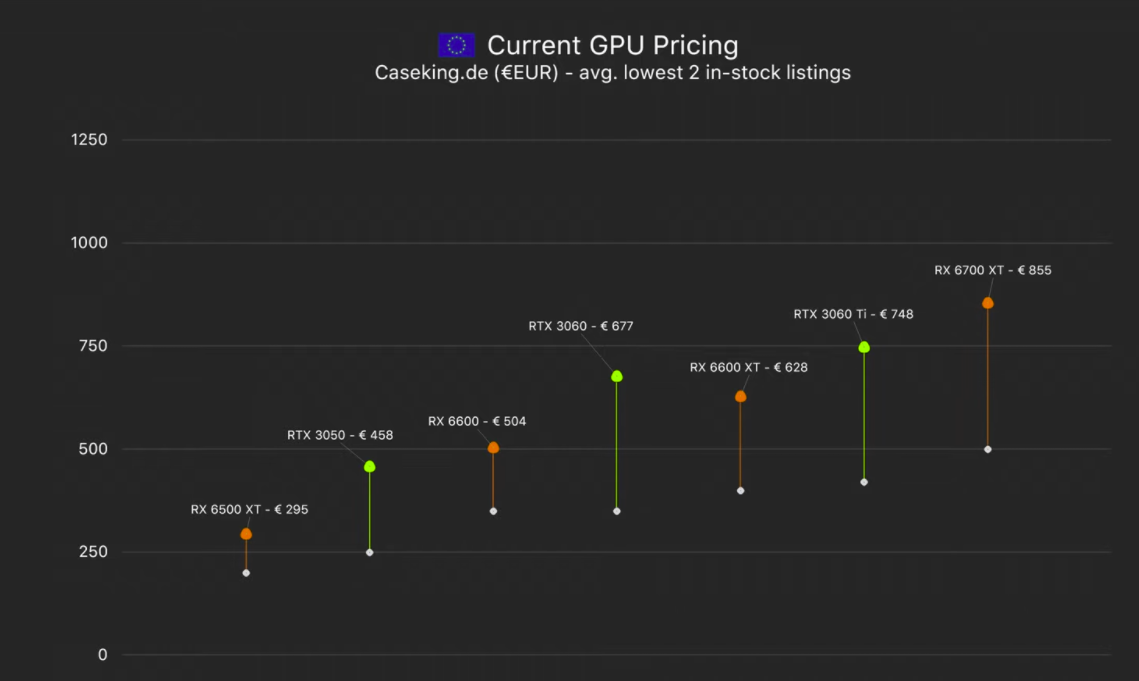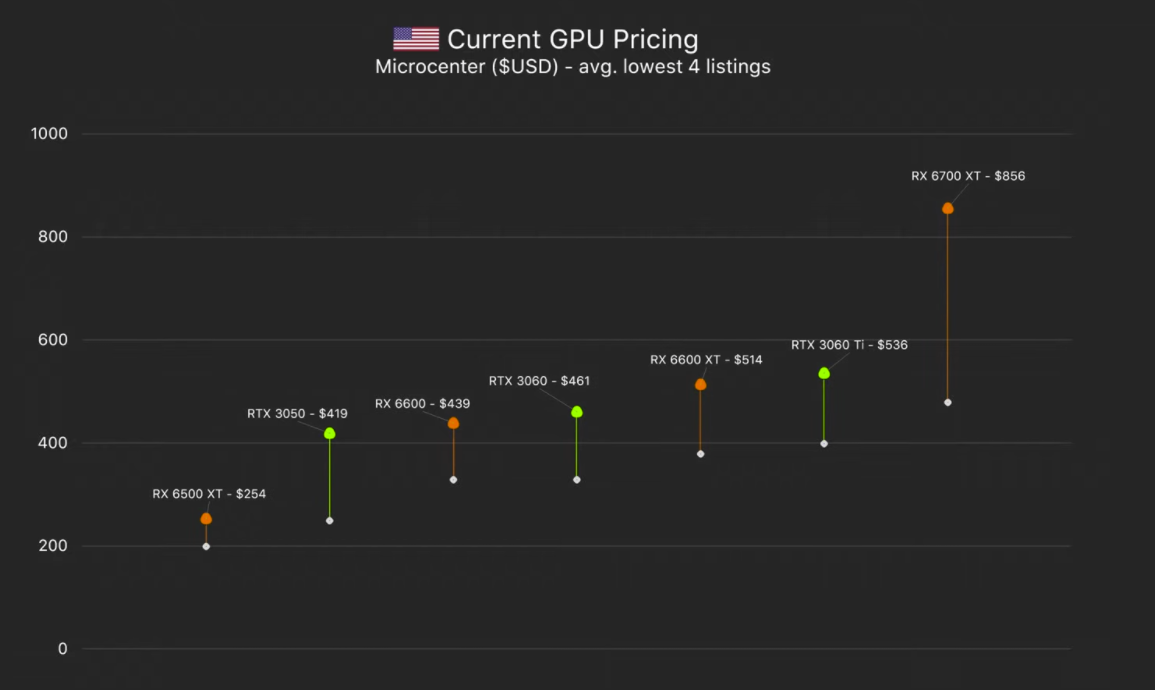 Например, GeForce RTX 3050 стоит столько же, как Radeon RX 6600, но в реальности намного проигрывает последней в играх. Аналогичные выводы можно сделать из противостояния GeForce RTX 3060 и Radeon RX 6600 ХТ. Последняя обходит видеокарту NVIDIA абсолютно во всех играх, но стоит дешевле. А вот с GeForce RTX 3060 Ti и Radeon RX 6700 ХТ не всё так однозначно, ведь последняя в большинстве случаев оказывается быстрее, но и слегка дороже. Оценивать более дорогие видеокарты блогеры отказались, поскольку не видят в этом смысла. Цены там запредельные, а значит оптимальный вариант стоит выбирать из среднебюджетных моделей.