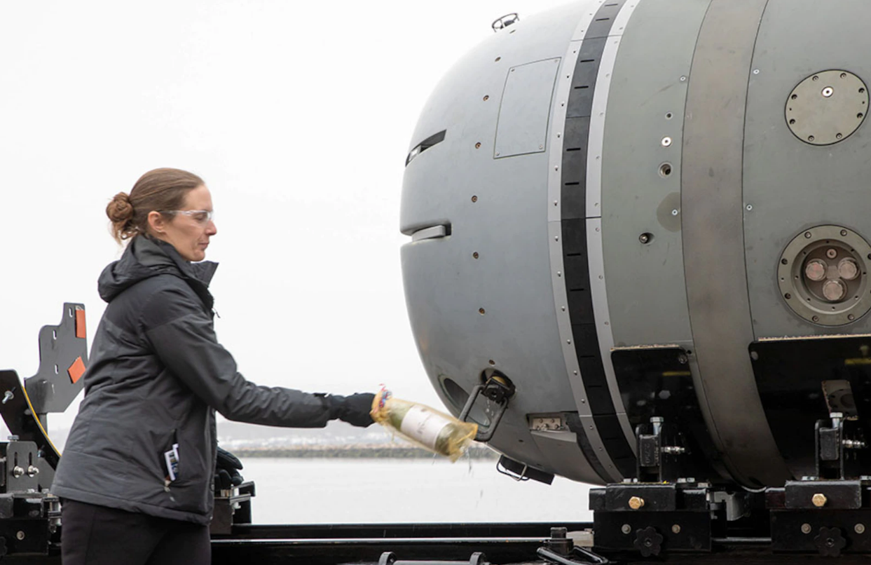Шерил Миерзва, технический менеджер программы беспилотного подводного аппарата большого водоизмещения Snakehead (Naval Undersea Warfare Center Division Newport), "окрестила" подводный аппарат на испытательном полигоне залива Наррагансетт в Ньюпорте, штат Род-Айленд, 2 февраля 2022 года.