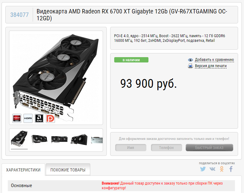 Заглянув в Регард мы видим сразу два сюрприза: купить видеокарту можно, но сложно. Кроме того, цены действительно оставляют желать лучшего. Давайте пройдёмся по пунктам. Для того чтобы стать счастливым обладателем Radeon RX 6700 XT, мало только лишь заплатить 90 тысяч. Вам придётся собрать компьютер с нуля.