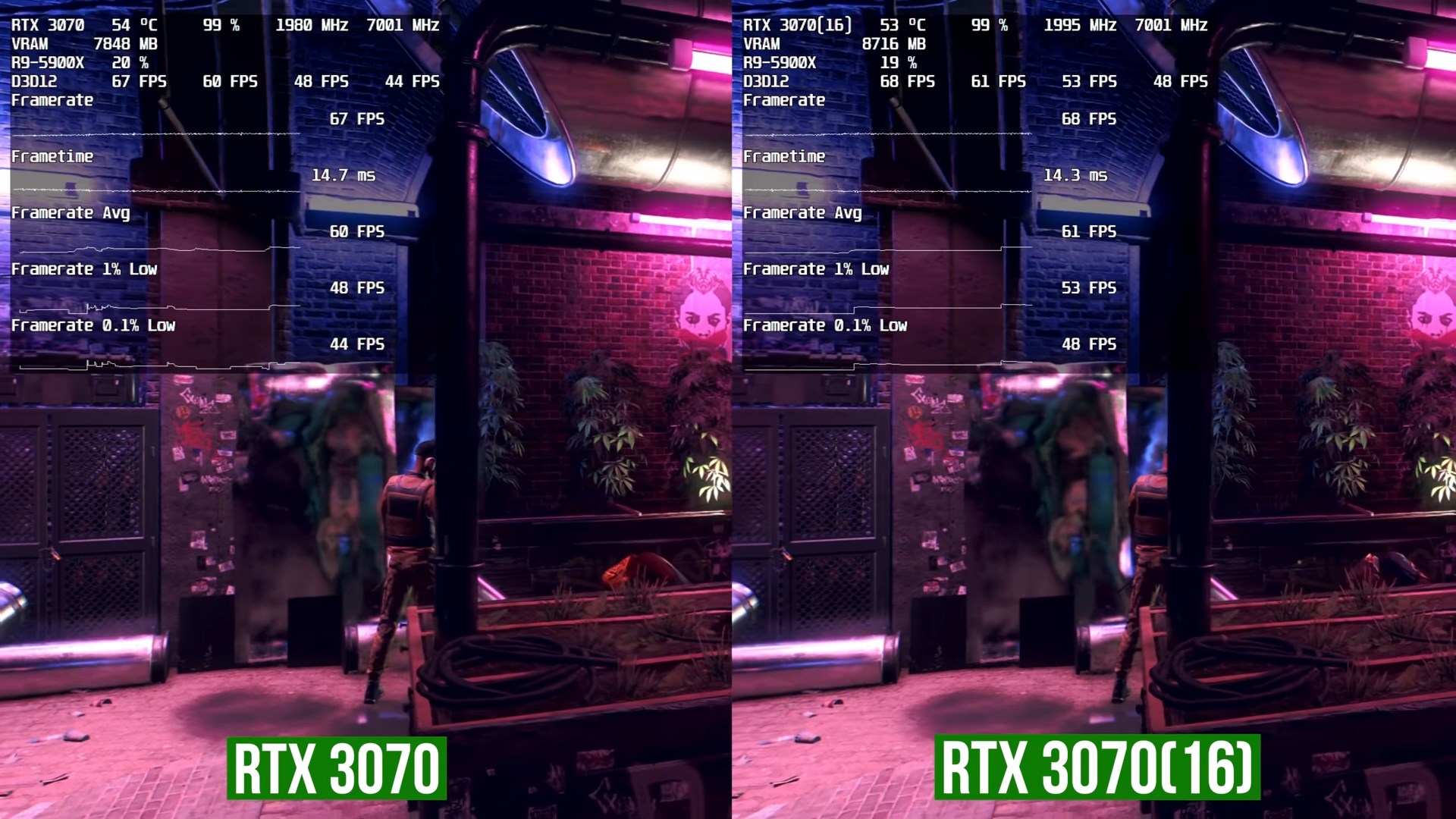 В Ghost Recon Breakpoint с максималками и 4К разница по среднему фреймрету между картами составляет около 5%. Godfall тоже извлёк пользу из дополнительной видеопамяти: модифицированная карта выдаёт на 10% больше FPS и куда меньше фризов и микростаттеров.